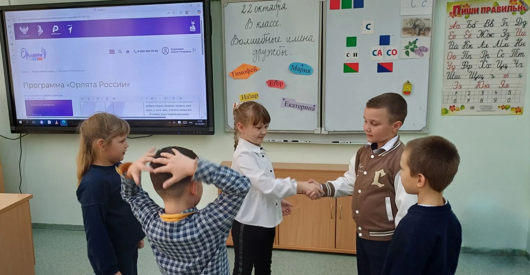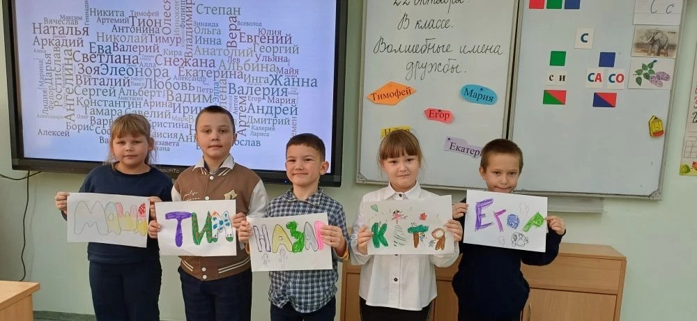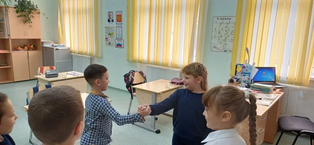 В рамках программы "Орлята России" в 1 классе прошло занятие под названием "Волшебные слова дружбы". Цель данного занятия: способствовать доброжелательному межличностному общению в классе. Началось занятие с игры "Это - я". Затем ребята обсудили вопрос: для чего нужны имена? Также ребята учились демонстрировать доброжелательное отношение к сверстникам, умение общаться друг с другом, составили и проговорили правила дружбы. В заключение ребята воплотили свои имена в искусстве, в красивых разноцветных картинках.